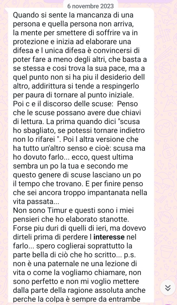 “E per finire penso che sei ancora troppo impantanata nella vita passata… Non sono timori e questi sono i miei pensieri che ho elaborato stanotte. Forse più duri di quelli di ieri, ma dovevo dirteli prima di perdere l’interesse nel farlo…”